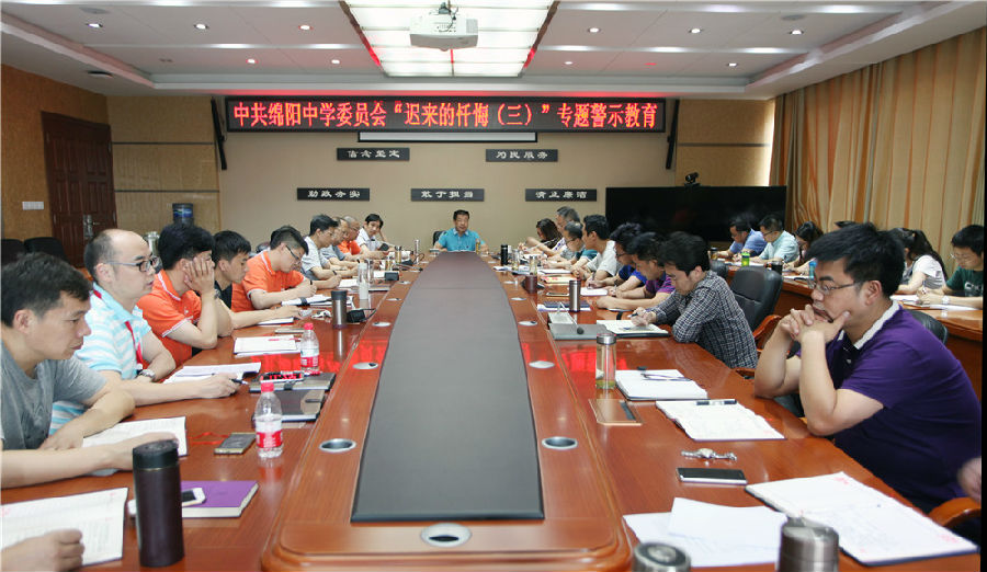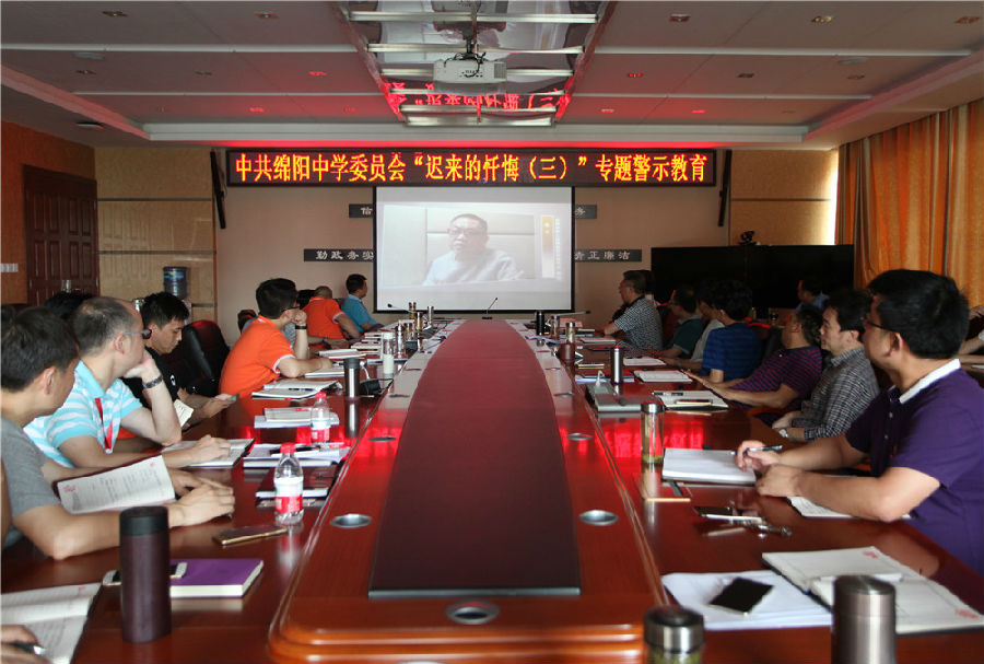 2017年6月29日下午,中共绵阳中学委员会在学校通惠楼行政会议室召开专题警示教育会,集体观看了专题警示教育片《迟来的忏悔(三)》。会议由绵阳中学纪委书记雷顺才同志主持,学校所有党委成员、行政领导观看了警示片,随后,大家积极发言,结合自己的工作谈观后感,警示教育深入人心。