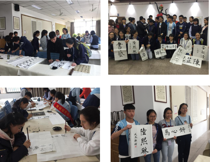 3月28日,香港圣保禄学校一行36人惠临绵中,上午10点,来到六艺楼三楼,有10名圣保罗学校的学生组成一个小班与绵阳中学书法社的学生在一起交流。刚开始的时候,由于大家相互之间不太熟悉,显得有些腼腆,但是通过“一对一”的交流,同学们的心胸逐渐地打开了,在谈笑中聊起了家常、学习生活情况。香港同学说她们小时候学过书法,但是现在不太记得了,绵中书法社的学生非常细心地教她们如何执笔,如何书写,香港同学学习后觉得有很大的长进,慢慢喜欢上了书法,认为书法是我们中华民族的一传统优秀文化,我们应该好好地传承。绵中书法社的同学还以书法作品相赠,留作纪念,香港同学们非常喜欢,连夸真是妙笔生花,一定好好珍藏。最后绵中艺术组全体老师、绵阳中学书法社学员以及香港交流师生在展览厅一起合影、留念。